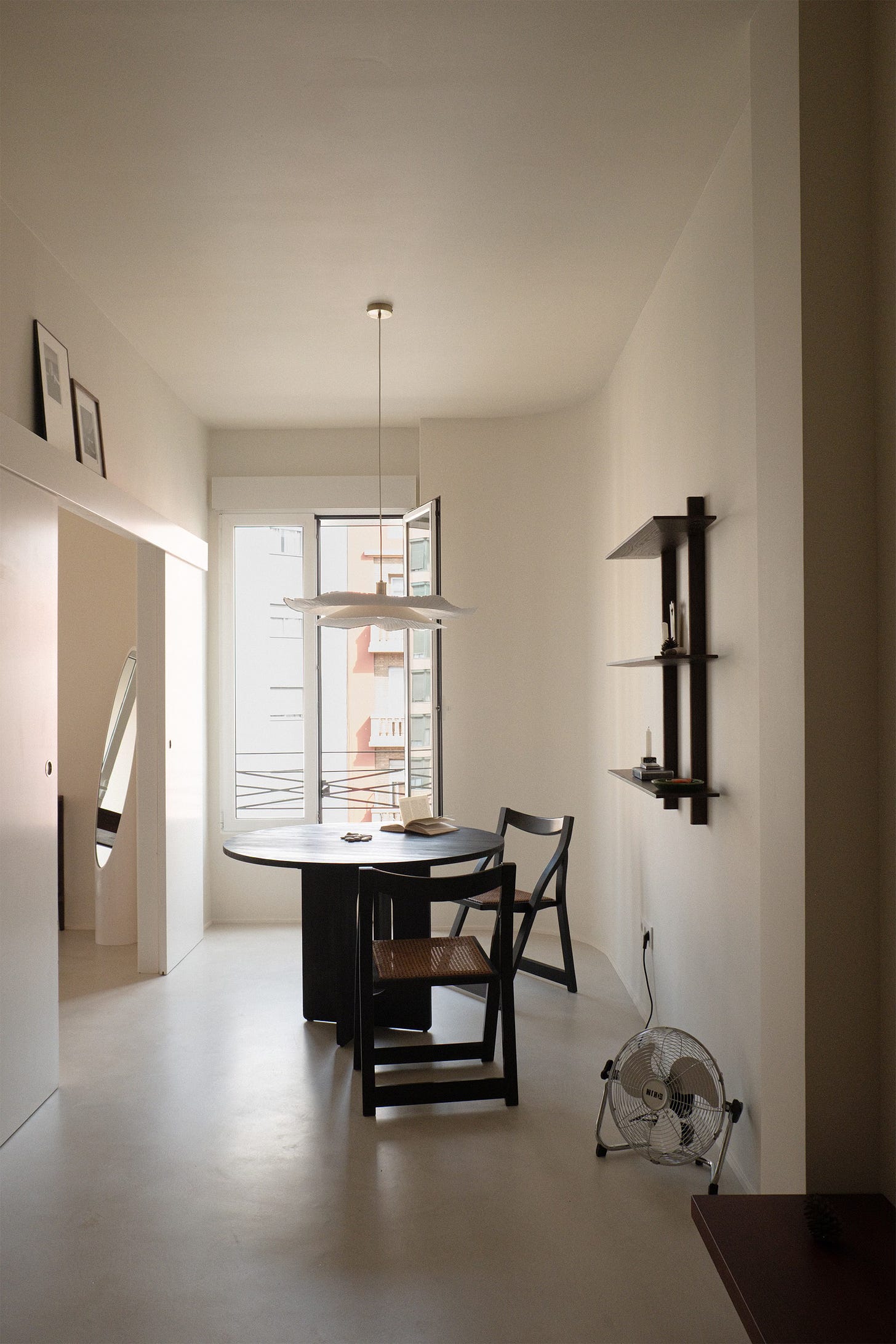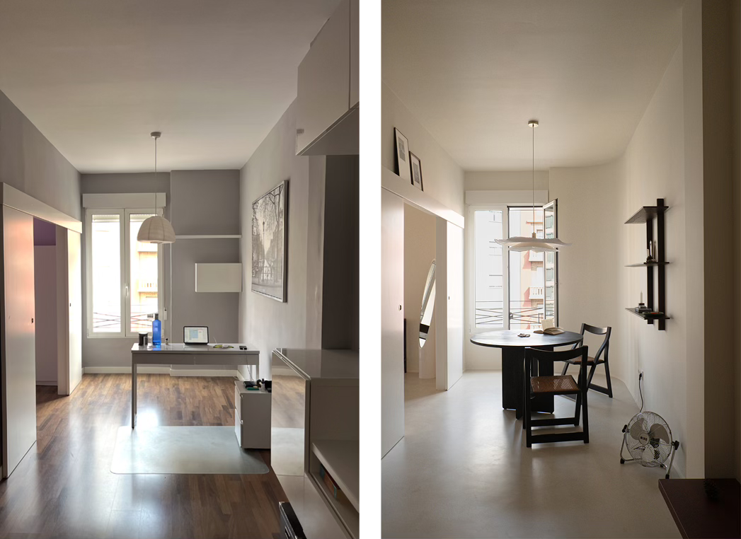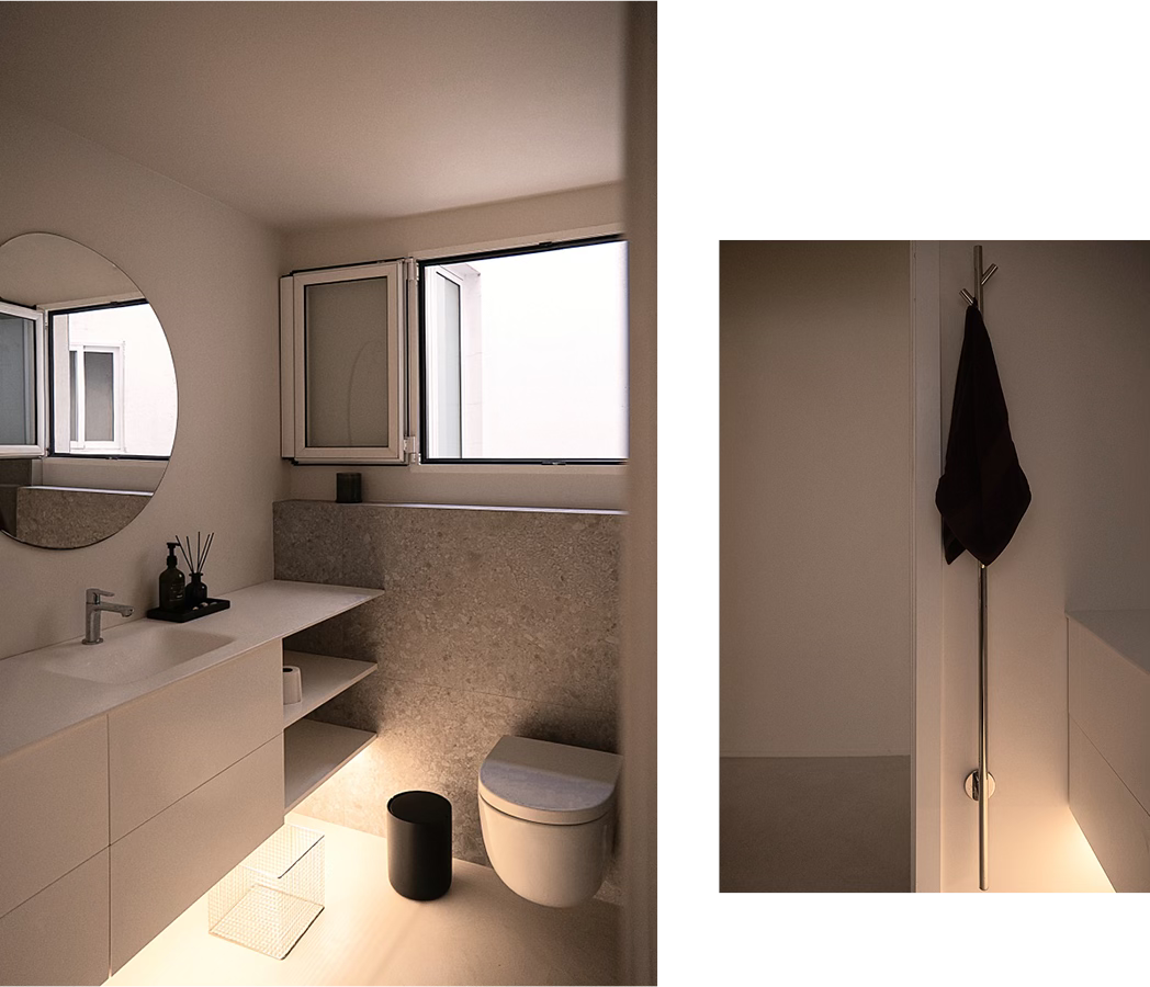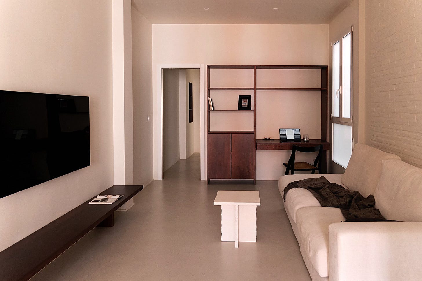 The new microcement floor allowed us to create a uniform surface with no direction or grain. Because the apartment has narrow, awkward corridors, laying tile or wood would have emphasised the linearity. Instead, microcement is visually light and does not attract attention to itself.