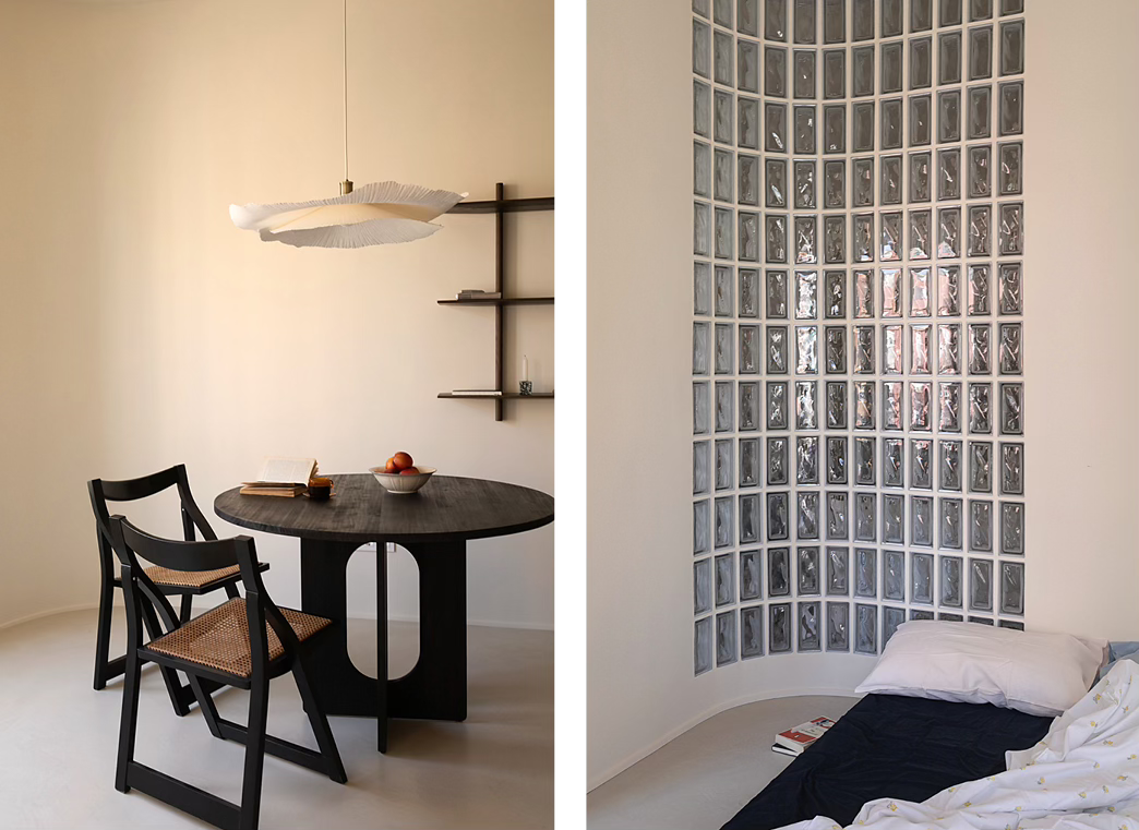 One of the as-found elements impossible to ignore was a curved glass-block wall between the living room and one of the bedrooms. I loved it. But, back then it didn’t have it didn’t have a counterpart. We added another curve to mirror the existing one and make the space feel more intentional. It also helped to soften the corner and “wrap” the already long room rather than ending it abruptly. The room felt calmer and less endless.