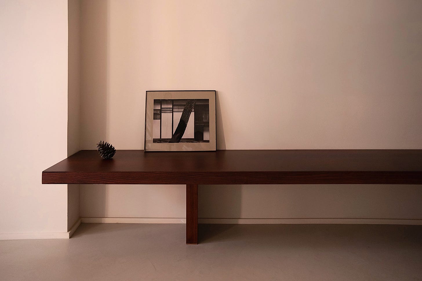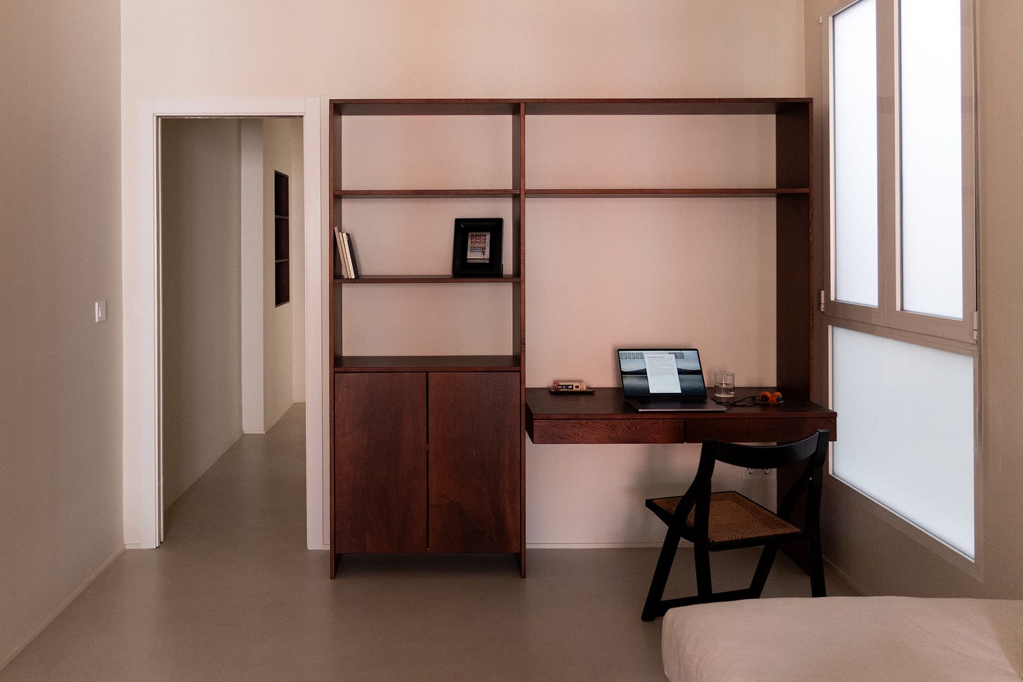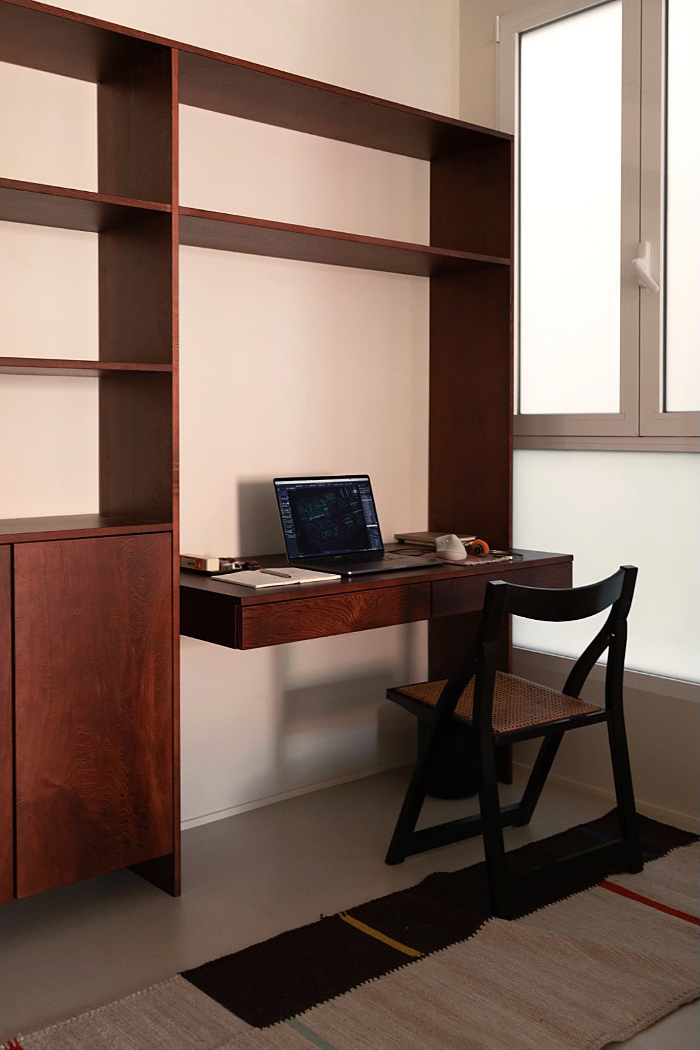 I wanted to bring that warmth and memory forward but in a simpler form. Shelves in the bedrooms, a shelf in the corridor, a low bench and a bookshelf with a desk in the living room. I placed joinery at the focal points throughout the apartment.