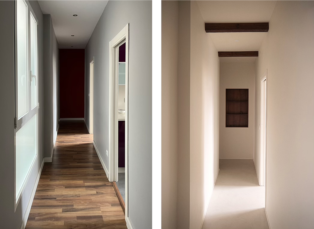 The first thing I saw when I entered the apartment was a long, narrow corridor lined with fake parquet. The walls were lilac in one room, grey in another, red in the third. The materials alone were making it feel busy.